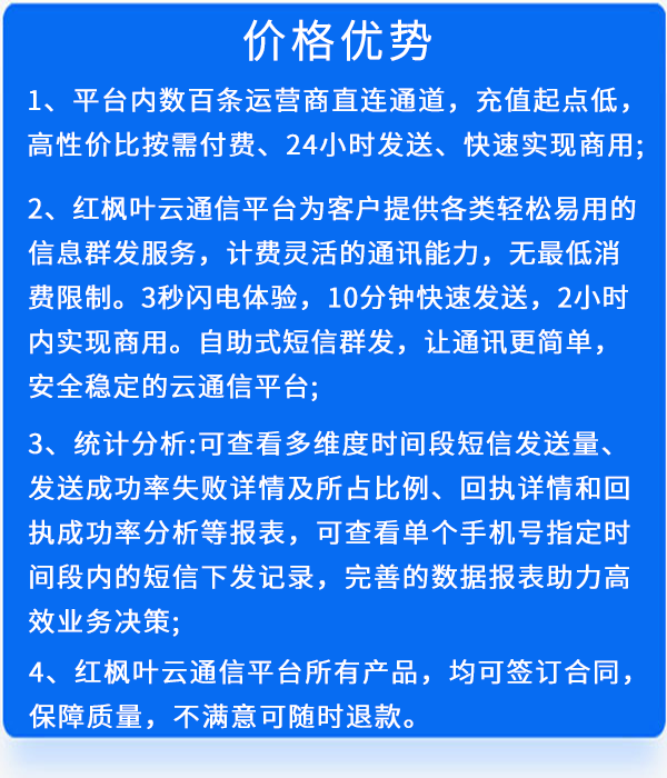 一分鐘注冊,五分鐘批量群發(fā),十分鐘短信彩信,閃信,視頻短信全部到達,注冊成功即可群發(fā)!全國全網(wǎng)發(fā)送,可靠穩(wěn)定、輕松群發(fā)、低門檻。短信58元起充,彩信98元起充,視頻短信98元起充,閃信79元起充!注冊成功,即可群發(fā)。平臺通過“紅楓葉”PaaS平臺將復雜的群發(fā)技術,封裝成簡單快捷的在線群發(fā)平臺,真正實現(xiàn)精于技術,簡于平臺。云通信平臺群發(fā)注冊網(wǎng)址: 168.sms10001.com