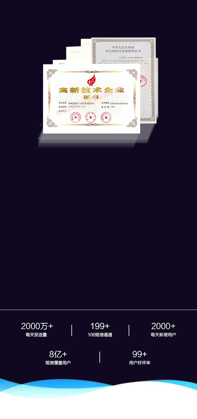 | 優(yōu)勢(shì)一:資質(zhì)齊全,十年短信平臺(tái)運(yùn)維經(jīng)驗(yàn),穩(wěn)定支撐數(shù)萬(wàn)客戶數(shù)億短信并發(fā),公司持有工信部頒發(fā)的增值電信業(yè)務(wù)經(jīng)營(yíng)許可證,全國(guó)106碼號(hào)資源使用證,中國(guó)移動(dòng)sa合作協(xié)議,及湖南省科學(xué)技術(shù)廳等部門頒發(fā)的國(guó)家高新技術(shù)企業(yè)證書,穩(wěn)定可靠全程為短信群發(fā)加速。 |